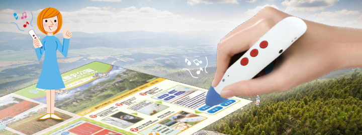 音声ガイドペンはペン型をした音声ガイド機で、特殊な印刷物をタッチすることで音声ガイドが流れます。 電源ボタンを2〜3秒間長押しすると電源が入ります。 聞きたい言語を選択します。 写真など聞きたい箇所をタッチすると音声ガイドが流れます。