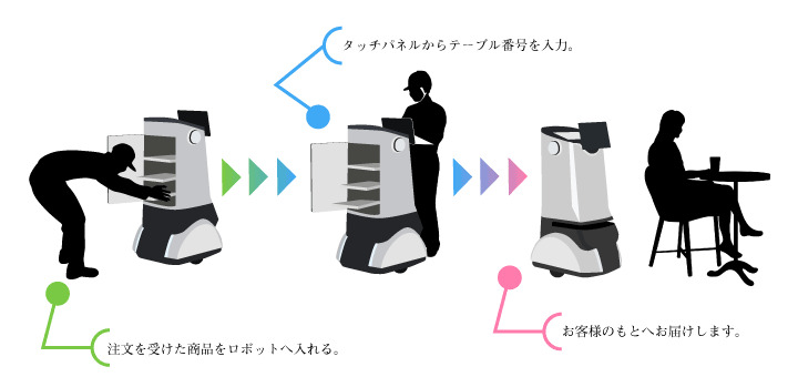 ロボット上部のタッチパネルから操作が可能。 簡単操作ですぐにお客様のもとへお届けに向かいます。初めての方、機械の操作が苦手な方でも安心してご利用頂けます。