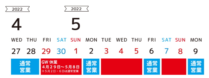 ※ 5月2日(月)・6日(金)は通常営業日となります。