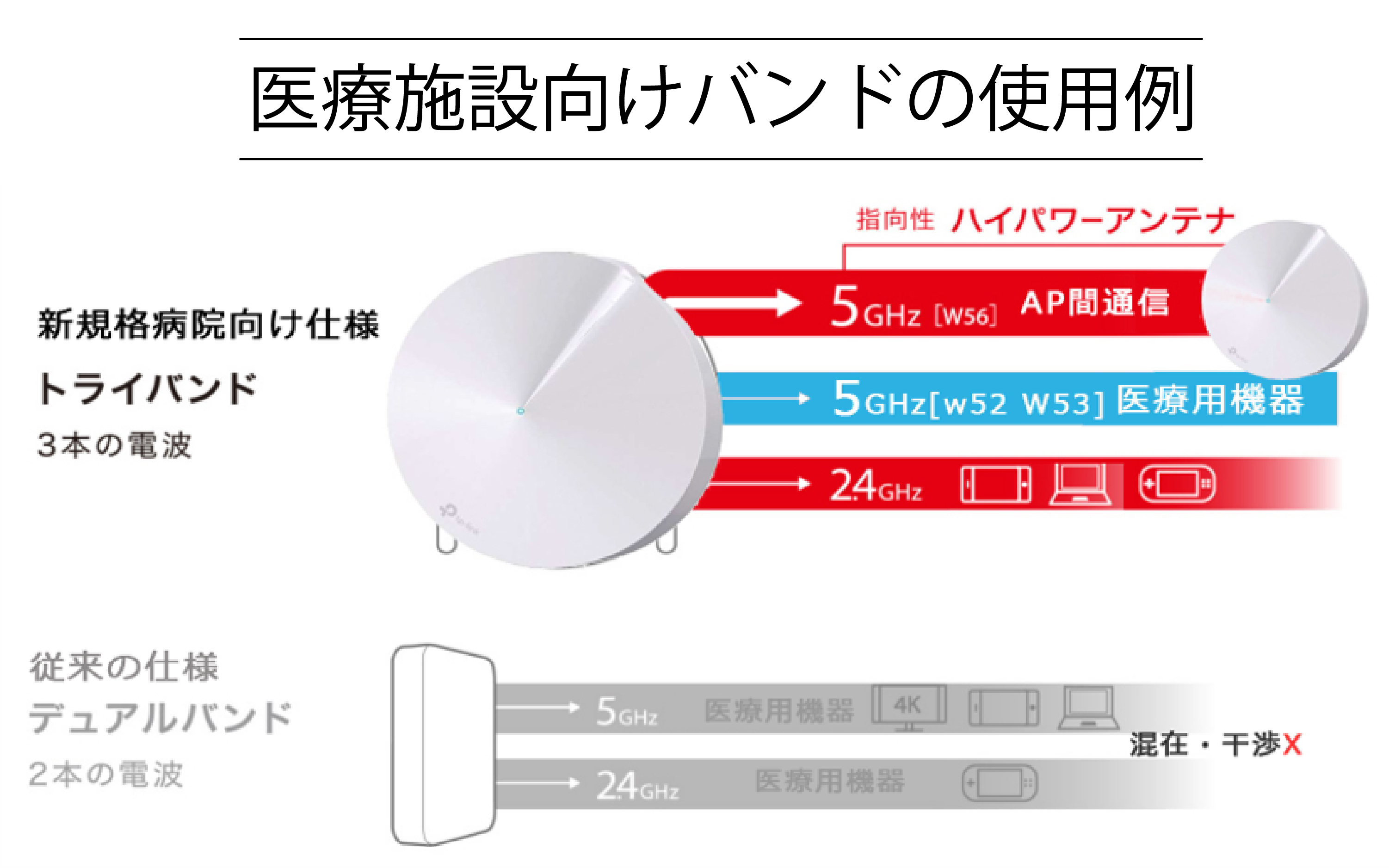 さらに、トライバンドによって医療機器と干渉しない周波数帯で住み分けができるため、病院でのWi-Fi利用が可能となります。従来の業務クオリティを損なうことなく、且つ安全な無線Wi-Fi環境の構築が実現できます。