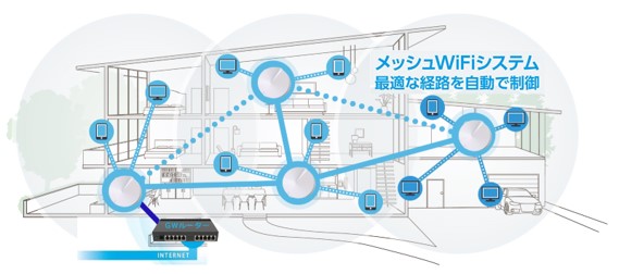 従来のWi-Fi通信をトライバンド(3つの周波数帯)Wi-Fi(We Mesh)を導入することにより、利用者のWi-Fi通信効率を大幅に上げ通信品質が向上されます。