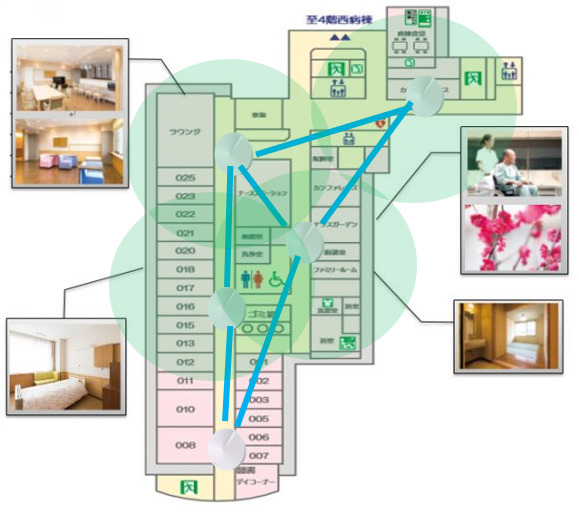 複数のアクセスポイントがロビーやラウンジの隅々まで網目状(メッシュ)に安定したWi-Fi電波で従来、隅の死角エリアでも高いWi-Fi耐性でカバーします。